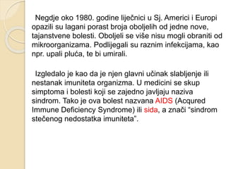 Sida, ili AIDS, je bolest koja rezultira slabljenjem imunološkog sustava, a najčešće se prenosi putem tjelesnih tekućina tijekom seksualnog odnosa, prenosom sa zaražene majke ili putem krvi. HIV virus inficira bijele krvne stanice, uzrokujući razne zdravstvene probleme koji mogu završiti smrću bez adekvatnog liječenja. Iako postoje napretci u liječenju HIV-a, prevencija ostaje ključna u borbi protiv širenja ove bolesti.