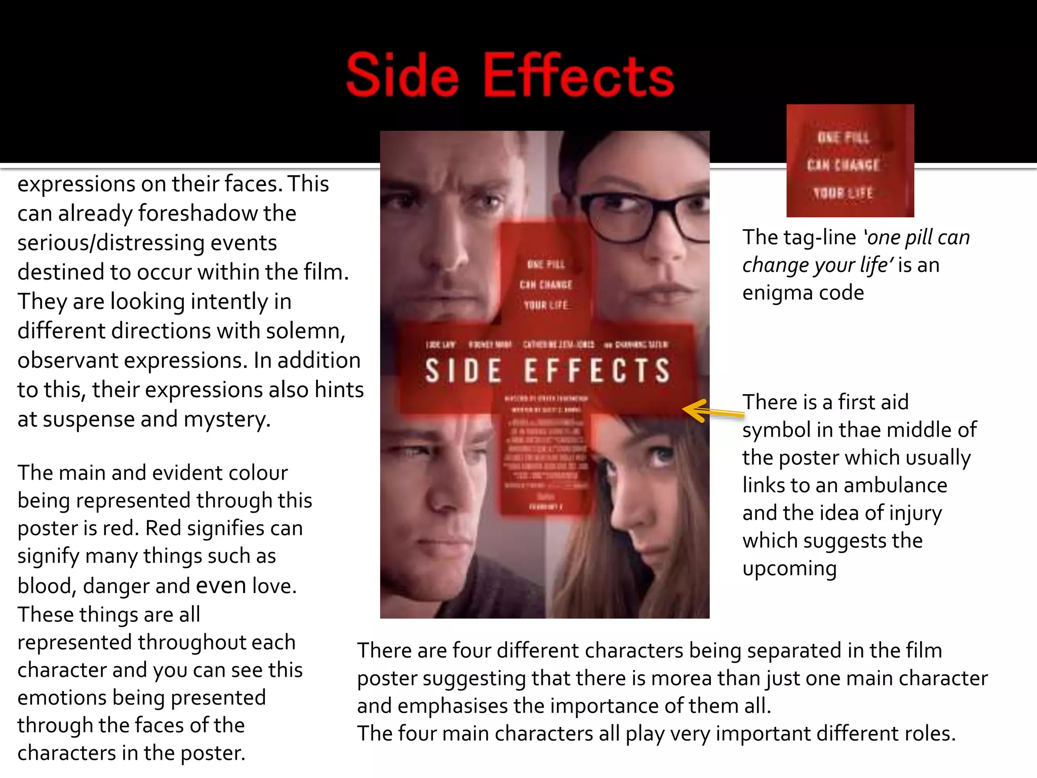 The poster depicts four characters with severe expressions, looking in different directions, which foreshadows the serious events of the film and creates suspense. Red is the dominant color, symbolizing blood, danger, and love, as represented by the characters' facial emotions. The tagline "one pill can change your life" and separation of the four important characters into different areas of the poster builds mystery around the multiple main characters and importance of their roles in the film.