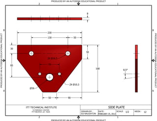 The document appears to be a technical drawing of some mechanical part, as it contains dimensions, labels for different views (Side A and Side B), and a note indicating it was drawn by someone at a technical institute. It shows top and side views of a rectangular part with various holes, slots, and protrusions. The drawing is labeled as being produced by an Autodesk educational product and includes the date and scale.