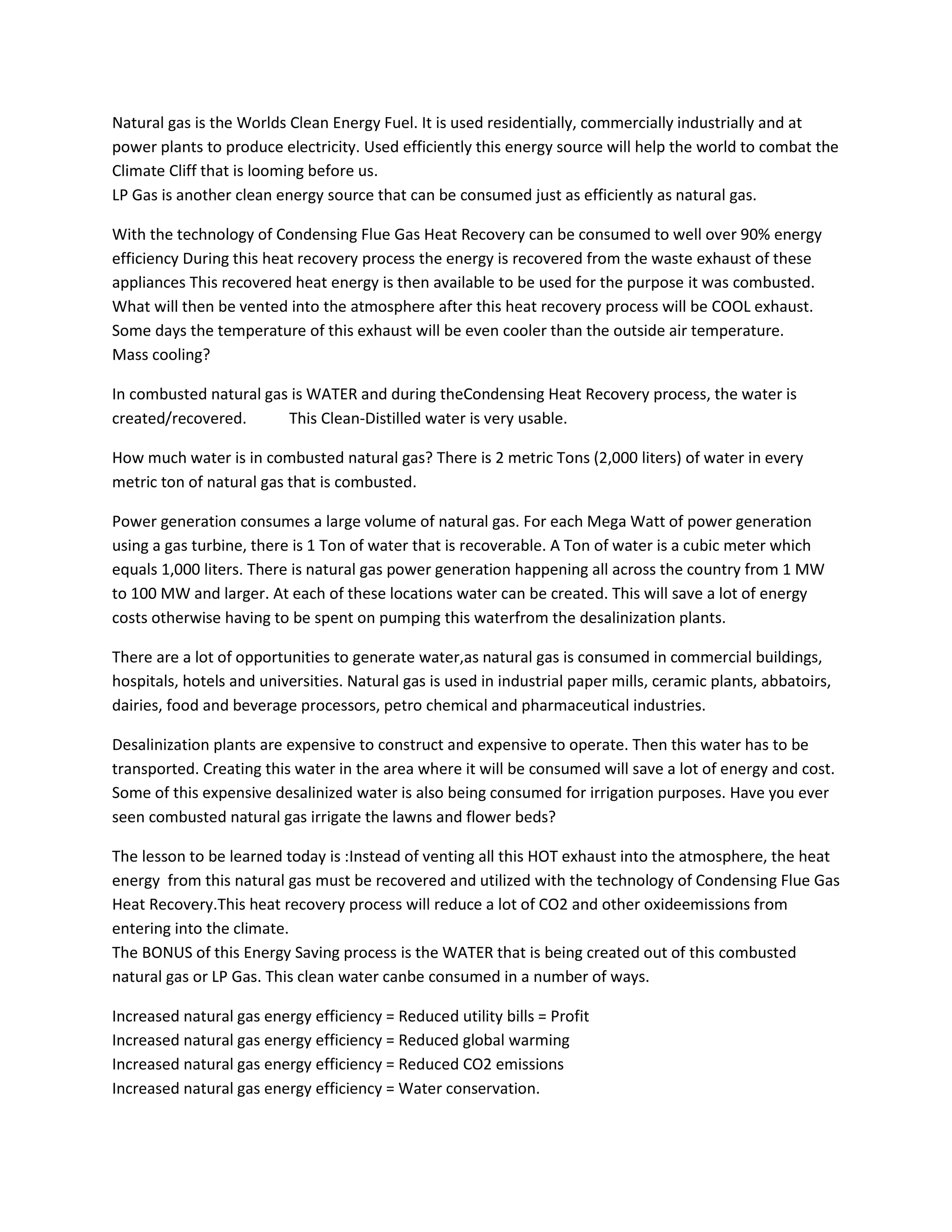 Natural gas combustion produces water that can be recovered through condensing flue gas heat recovery technology. This process recovers over 90% of the energy from natural gas, producing cool exhaust and distilled water from the water vapor in natural gas. Power plants and other industrial facilities that use natural gas could generate and locally distribute significant amounts of water by implementing this technology, avoiding the high costs of desalination and water transportation. Increased natural gas energy efficiency through heat recovery provides benefits like reduced emissions and utility bills while conserving water resources.
