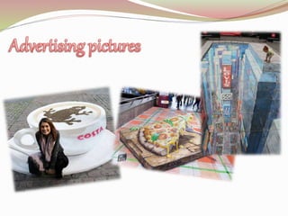 3D sidewalk art involves using mathematical equations and optical illusions to paint realistic 3D images directly onto sidewalks and public spaces. The art form was pioneered by Kurt Wenner and has grown in popularity for both public art installations and advertising. 3D sidewalk paintings take skill to create realistic optical illusions and immerse viewers by making the artwork appear to be interacting with the environment.