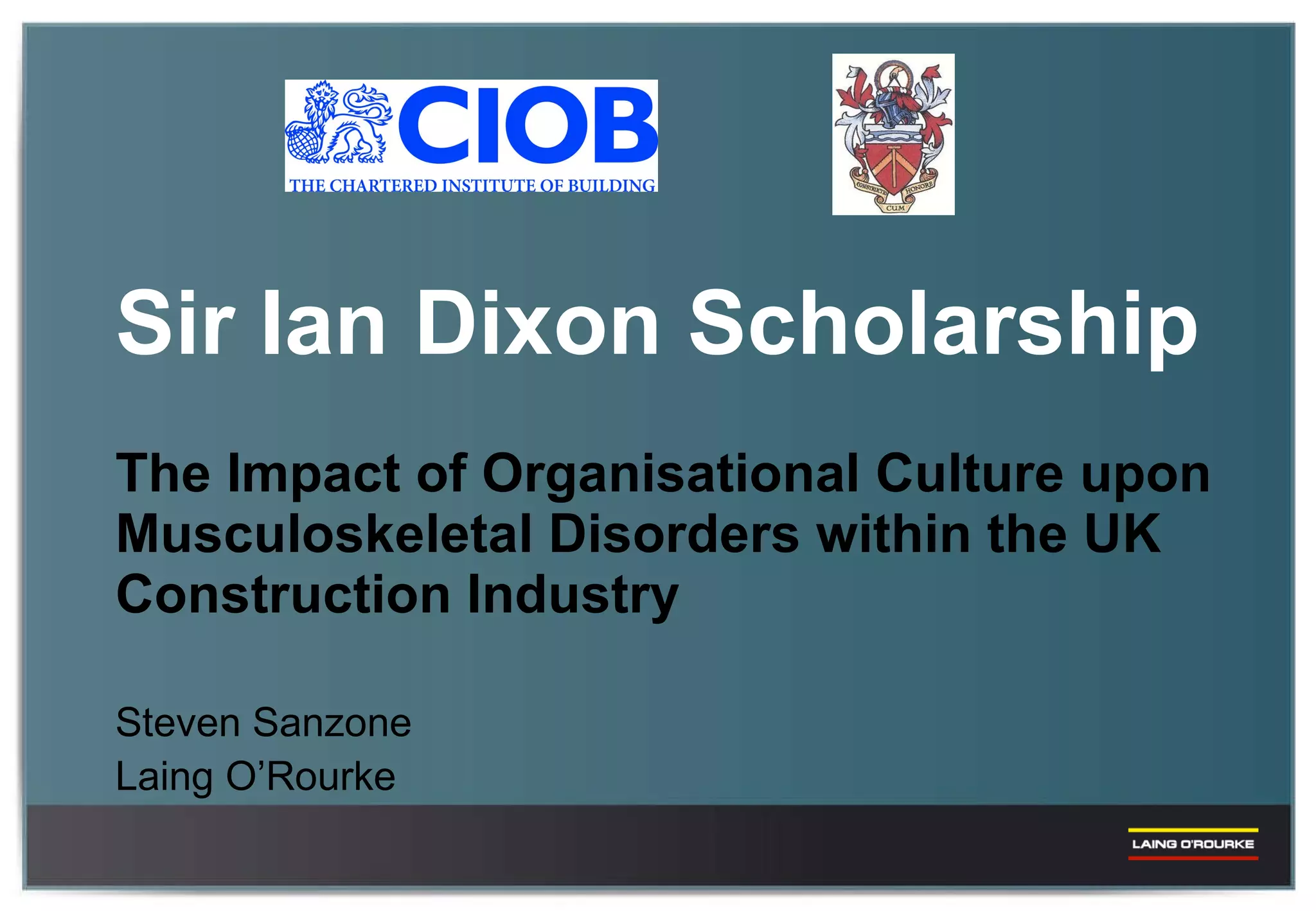 - The document summarizes Steven Sanzone's research on the impact of organizational culture on musculoskeletal disorders (MSDs) within the UK construction industry.