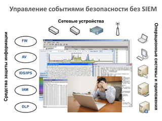 Документ посвящен управлению событиями безопасности с использованием SIEM систем и охватывает ключевые компоненты и технологии, включая сбор и анализ логов, мониторинг угроз и реагирование на инциденты. В нем также рассматривается эволюция SIEM, его распространение и требования к реализации, поддерживаемые продуктами на рынке. Упоминаются ведущие игроки в сфере SIEM и их функциональные возможности, что подчеркивает важность корректного выбора и использования таких систем.