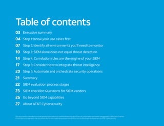 This document serves as an evaluator's guide for selecting a Security Information and Event Management (SIEM) solution, outlining six crucial steps for success. It emphasizes the importance of understanding specific use cases, identifying monitored environments, and integrating threat intelligence and automation into security operations. Ultimately, it aims to assist organizations in effectively preparing for SIEM deployment to enhance threat detection and management.