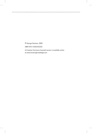 This document is a table of contents for a book about knowledge and learning. It lists the chapter titles and section headings, which discuss topics like theoretical views of knowing and learning, changes in knowledge environments, implications of those changes, and designing for learning. The table of contents provides an overview of the book's structure and topics of discussion, with a focus on how knowledge and learning have been impacted by technological changes.