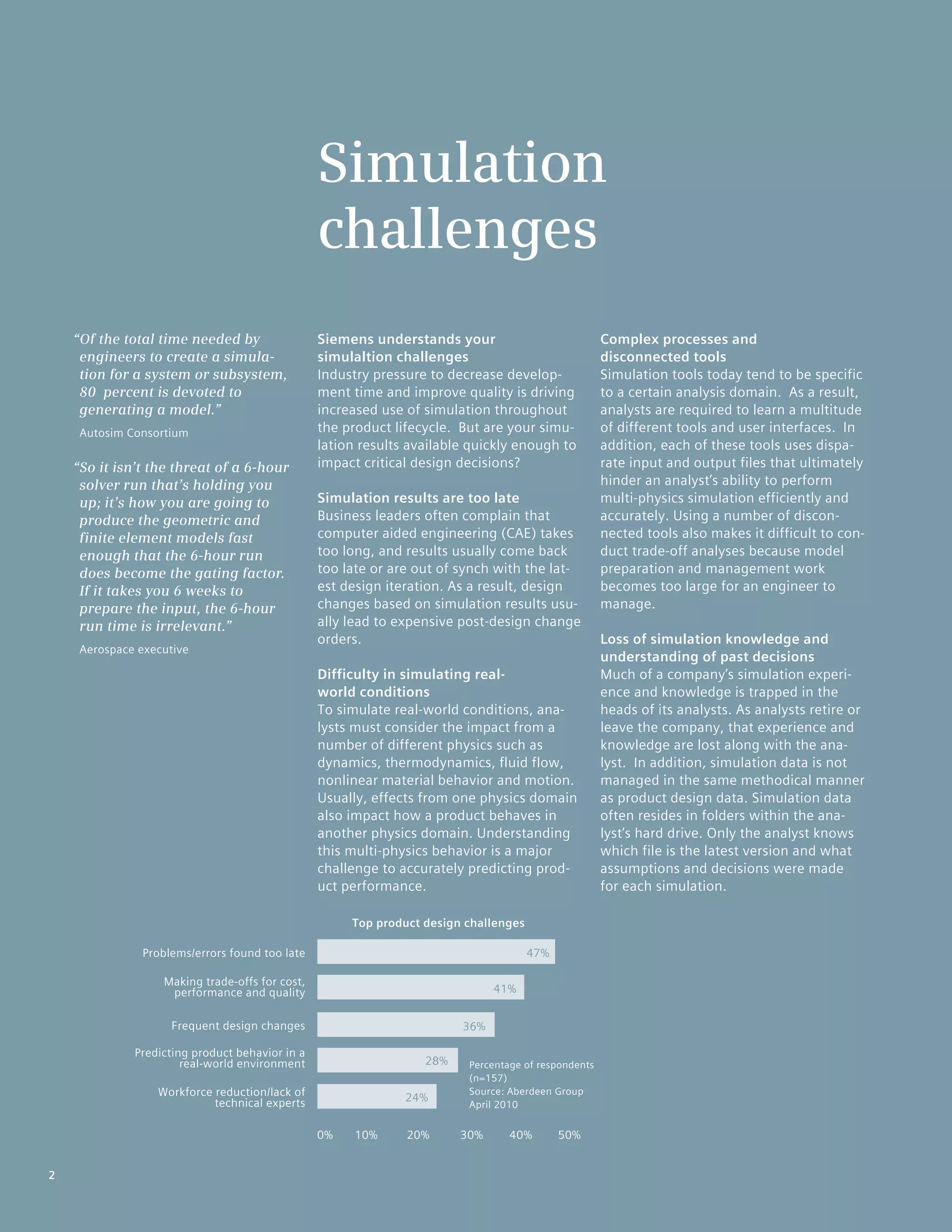 The document discusses challenges with traditional computer aided engineering (CAE) software, including slow simulation times, disconnected tools, and loss of knowledge as analysts leave. It introduces NX CAE software from Siemens PLM, which aims to address these challenges by providing a fully integrated environment for advanced simulation modeling, multi-discipline simulation, and leveraging simulation results to make smarter decisions across the product lifecycle. Key benefits of NX CAE include reducing simulation time by up to 70% through associated modeling and a superior geometry foundation.