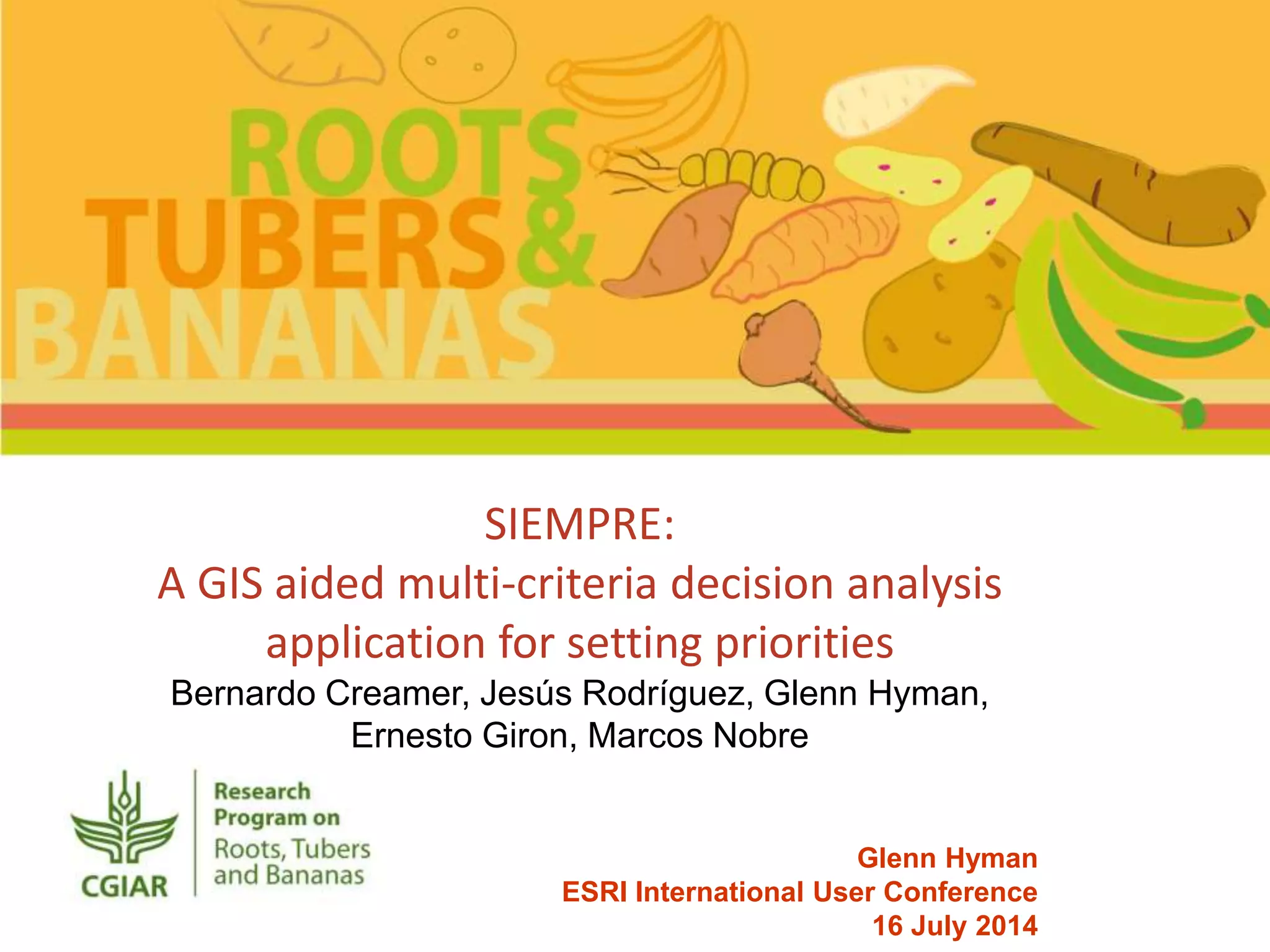 The document discusses 'siempre,' a GIS-aided multi-criteria decision analysis (MCDA) application designed to prioritize projects involving diverse stakeholders on various scales. It describes the analytical hierarchy process (AHP) for organizing decision analysis through quantitative and qualitative methods, utilizing spatial data for informed decision-making. The application aims to improve socio-economic conditions, particularly in rural Colombia, focusing on agricultural strategies like bean production to enhance food security and reduce poverty.