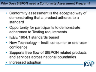 The document outlines the IEEE Conformity Assessment Program (ICAP) for Siepon, detailing the need for conformity assessments to ensure products meet standards and instill consumer confidence. It describes various testing models (1st, 2nd, and 3rd party) and the roles of entities involved in the certification process. Additionally, it discusses the importance of interoperability in digital communications and the steps for achieving consistent certification and product validation.