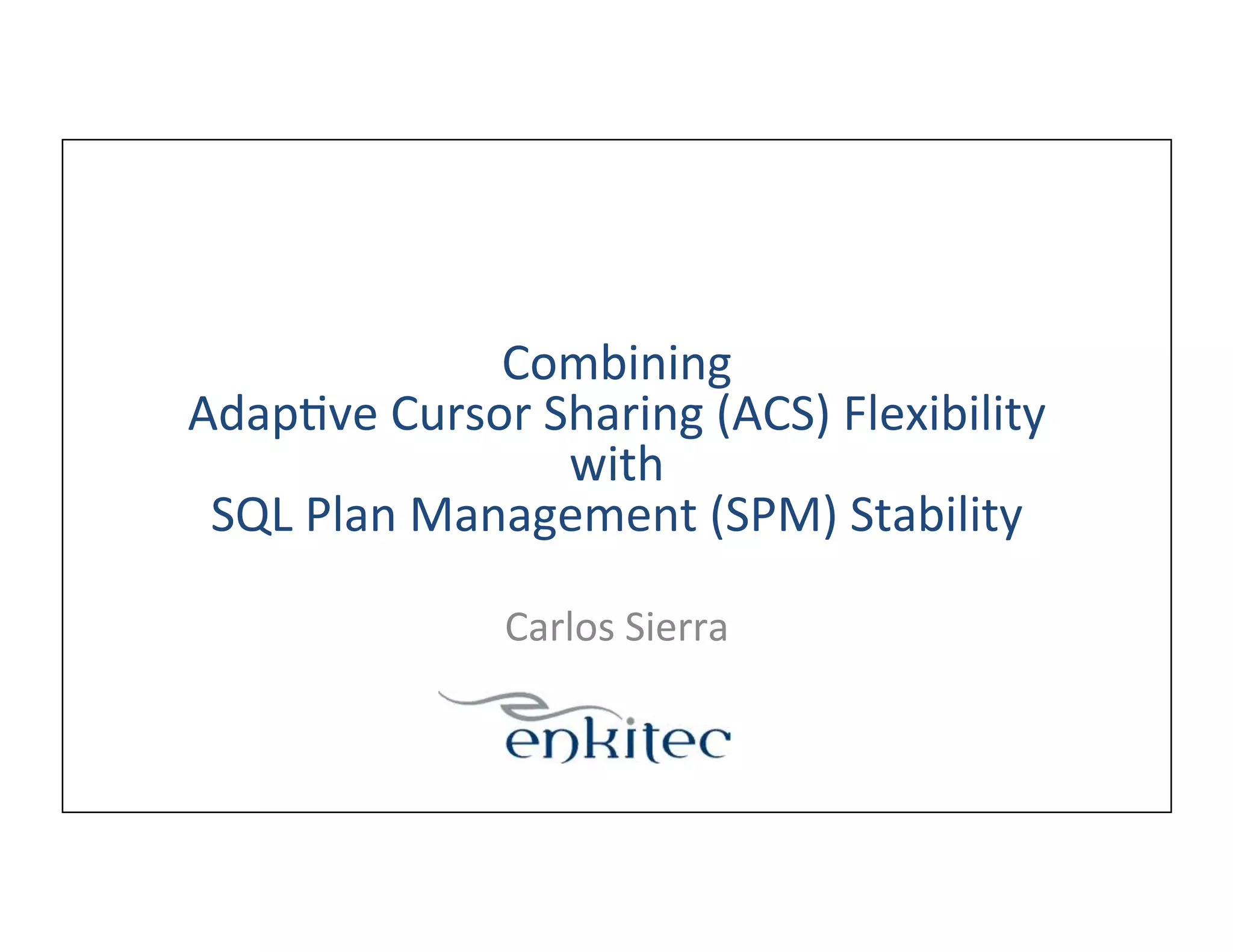 This document discusses combining plan flexibility through adaptive cursor sharing (ACS) with plan stability through SQL plan management (SPM). ACS allows Oracle to use multiple optimal execution plans for a SQL statement depending on the selectivity of bind variables. This provides flexibility to address plan flipping due to changing bind variable values while maintaining stability. The document outlines the benefits and challenges of ACS, as well as how SQL statements become bind sensitive to take advantage of ACS. It recommends using ACS and SPM together to gain both flexibility and stability in execution plans.