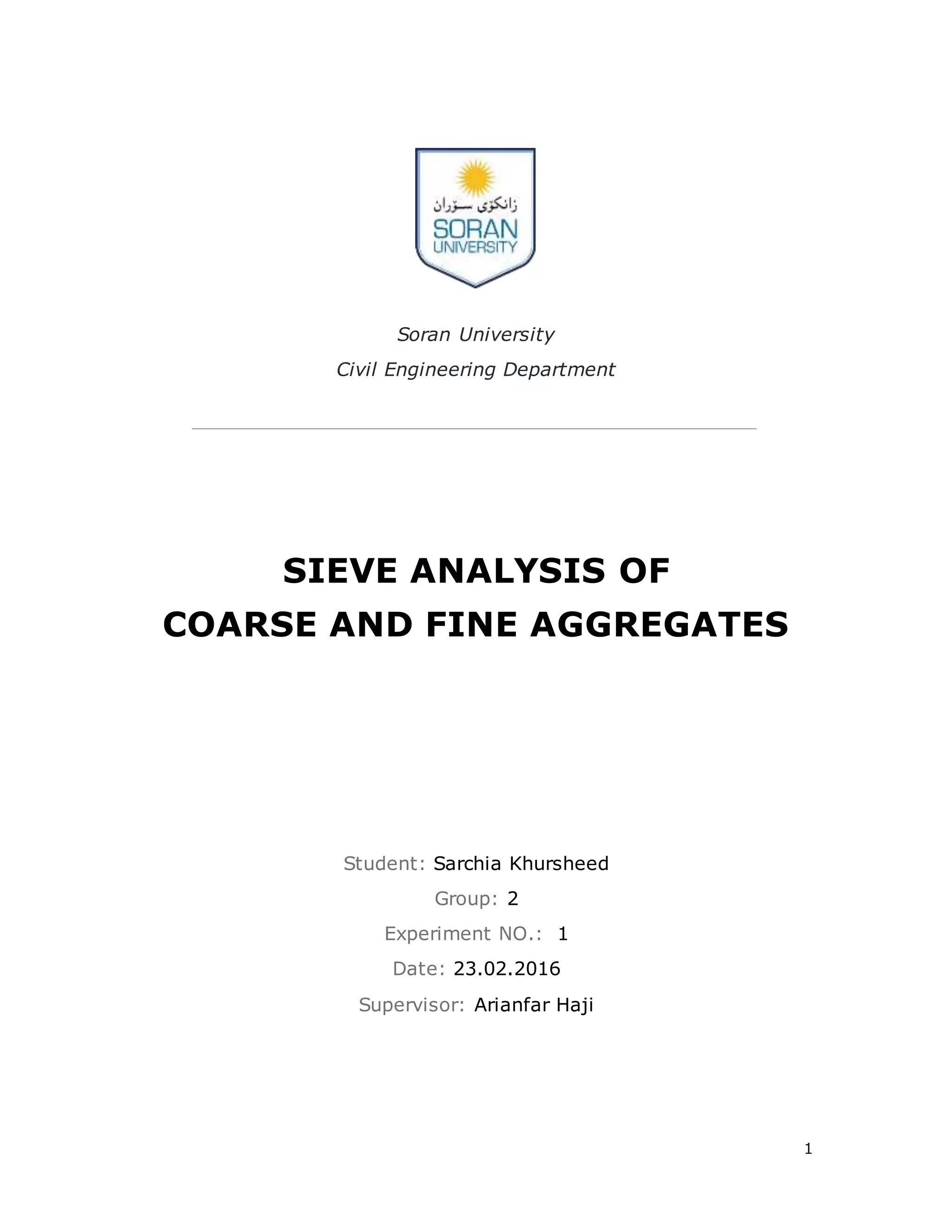 1. The document summarizes a sieve analysis test performed on coarse and fine aggregates to determine particle size distribution.