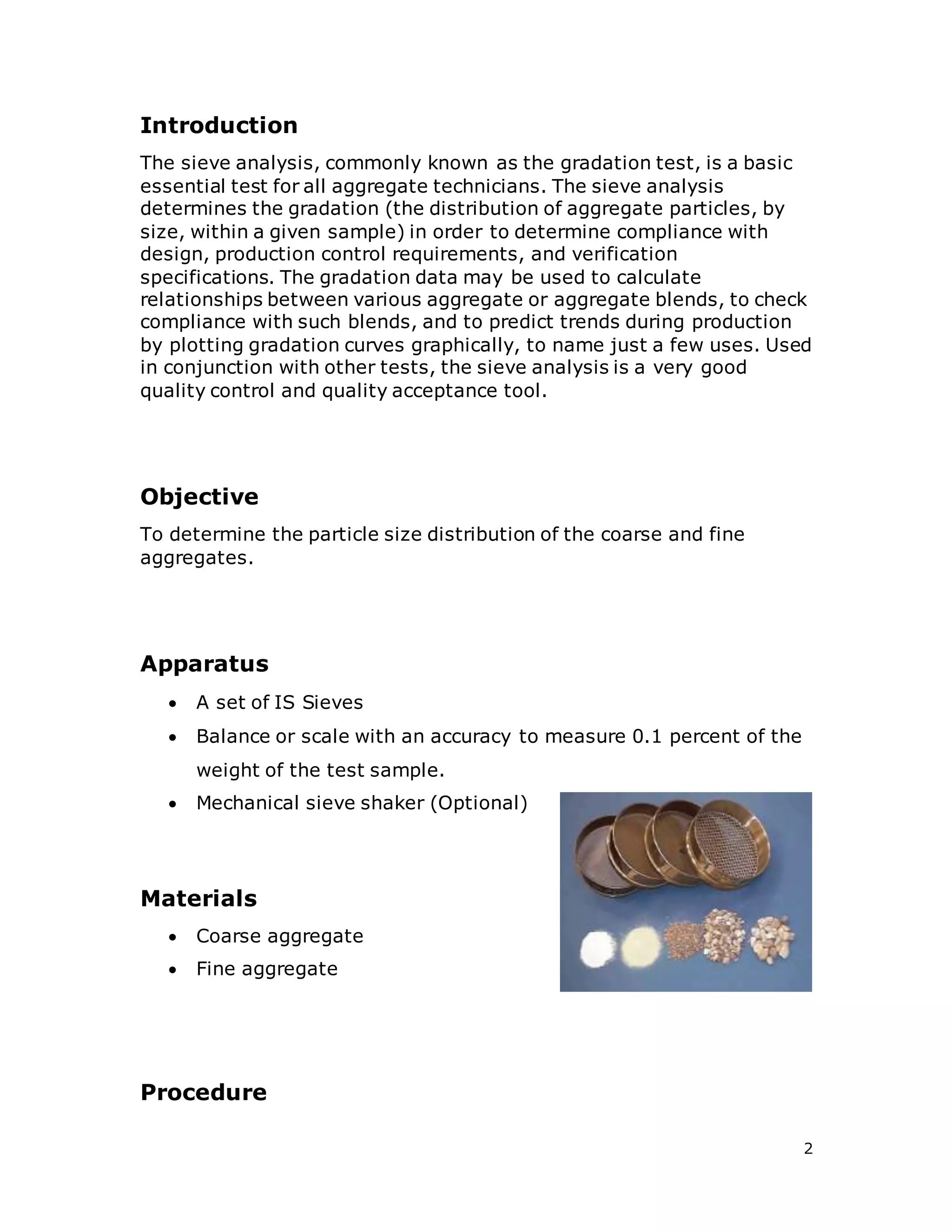 2. Sieve analysis involves sieving aggregate samples using a series of sieves and weighing the material retained on each sieve to determine the percentage passing and retained.