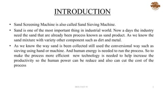 The document discusses the design and function of sand screening machines, emphasizing their importance in industrial applications where processed sand is required. It details various types of sieving machines, from manual to motor-driven, designed to efficiently separate sand by size while reducing labor and costs. Additionally, the document outlines the construction, operation principles, and objectives of a new portable sieving machine to enhance productivity in construction and material processing.