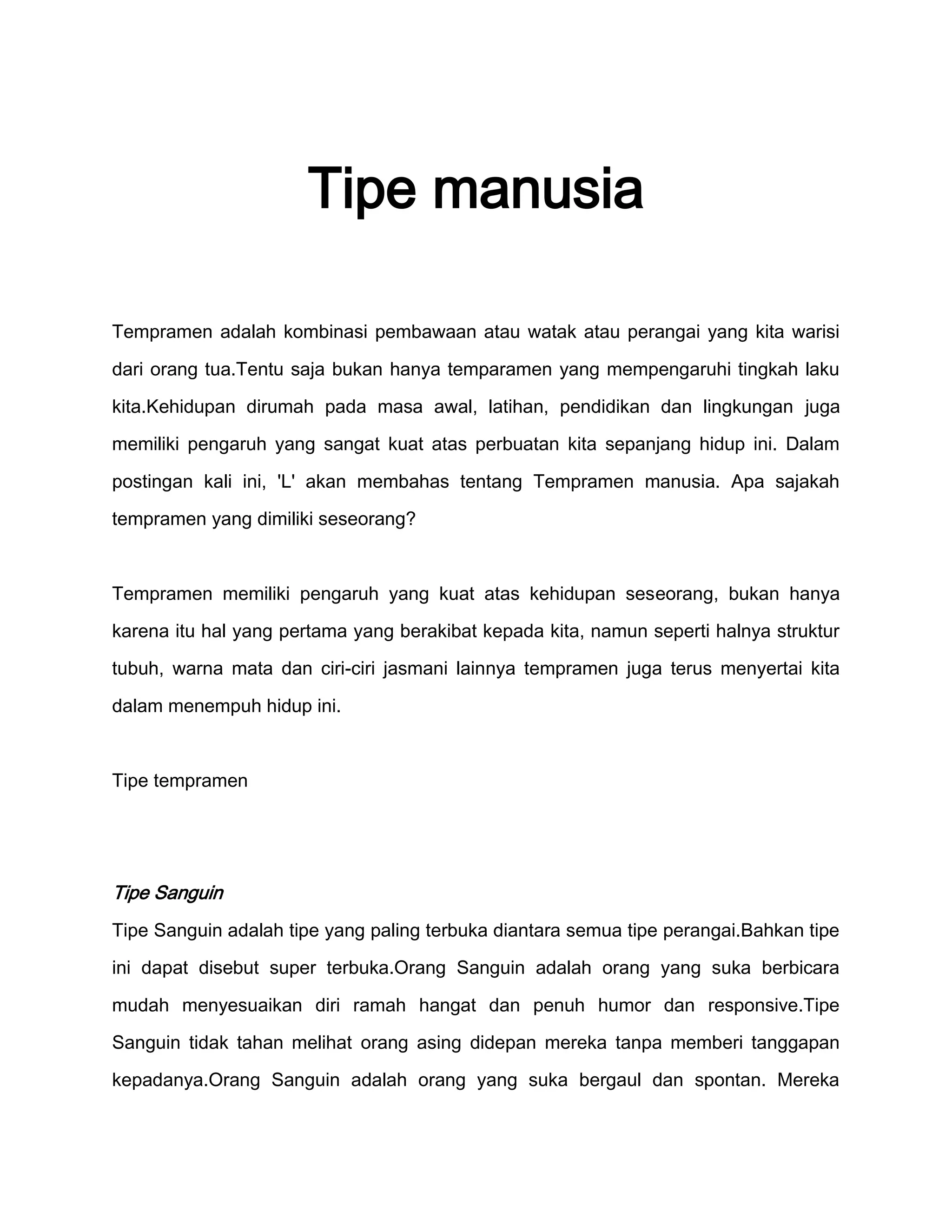 Temperamen merupakan sifat batin yang dipengaruhi oleh lingkungan dan budaya serta memiliki empat tipe utama yaitu sanguinis, koleris, melankolis dan plegmatis. Masing-masing tipe memiliki kelebihan dan kekurangan sehingga untuk memilih seseorang perlu mempertimbangkan tipe temperamennya dengan baik agar tidak menimbulkan masalah. Ilmuwan berusaha mengklasifikasikan temperamen untuk memahaminya lebih dalam.
