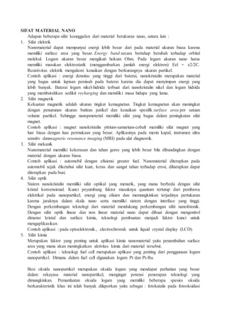 Nanomaterial memiliki beberapa sifat unggul seperti sifat elektrik, magnetik, mekanik, dan optik yang berbeda dari material konvensional karena ukuran nano dan luas permukaan yang besar, sehingga memiliki berbagai penerapan seperti baterai, MRI, otomotif, LCD, dan teknologi fuel cell.