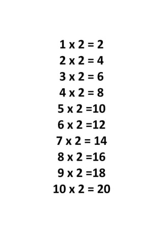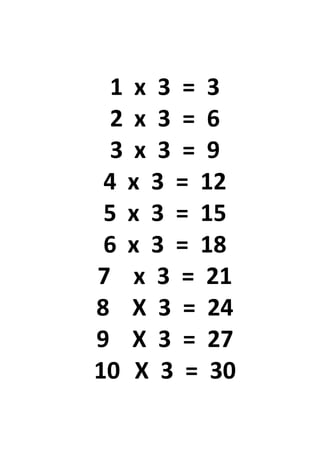 This document shows the multiplication tables for 2 and 3 up to 10. It lists the multiplication equations and answers for multiplying any number 1-10 by 2, resulting in answers from 2-20, and the same for multiplying any number 1-10 by 3, with answers ranging from 3-30.