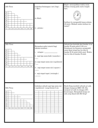 Dokumen ini mengandungi pelbagai soalan matematik yang berkaitan dengan bentuk geometri seperti segiempat tepat, segi tiga, dan kon, serta pengiraan perimeter, luas, dan volume. Ia juga menyentuh isu pengiraan peratusan dan pertukaran unit. Terdapat juga cabaran mengenai jualan dan keuntungan bagi item-barang serta beberapa soalan berkaitan umur dan masa.