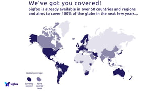 Sigfox is a global LPWA network that provides low power wireless connectivity to devices using small, low-cost modules. It allows devices to transmit small amounts of data using ultra-narrowband technology over long ranges with extended battery life. The document provides examples of how Sigfox can be used for parking management, asset tracking, home alarm systems, stolen vehicle recovery and other IoT applications by providing low-cost connectivity with benefits like real-time visibility, automation, and peace of mind.
