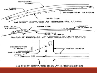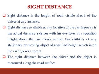 This document covers key concepts in highway engineering, focusing on sight distance, which is the visible distance a driver has to react to objects on the road. It discusses various types of sight distance, including stopping sight distance, overtaking sight distance, and the factors affecting them, such as the driver's reaction time and vehicle speed. Additionally, it emphasizes the importance of clear sight lines at intersections and recommends design standards for safe highway practices.