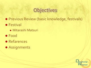 The document provides information about Shimogamo Shrine in Kyoto, Japan. It details several of the shrine's festivals including the Mitarashi Matsuri held in August, where devotees wash their feet in a sacred pond for blessings. During this festival, sticky rice balls covered in sweet sauce called mitarashi dango are invented and sold by numerous vendors. References and assignments are provided asking students to experience the food and discuss the shrine's festivals online.