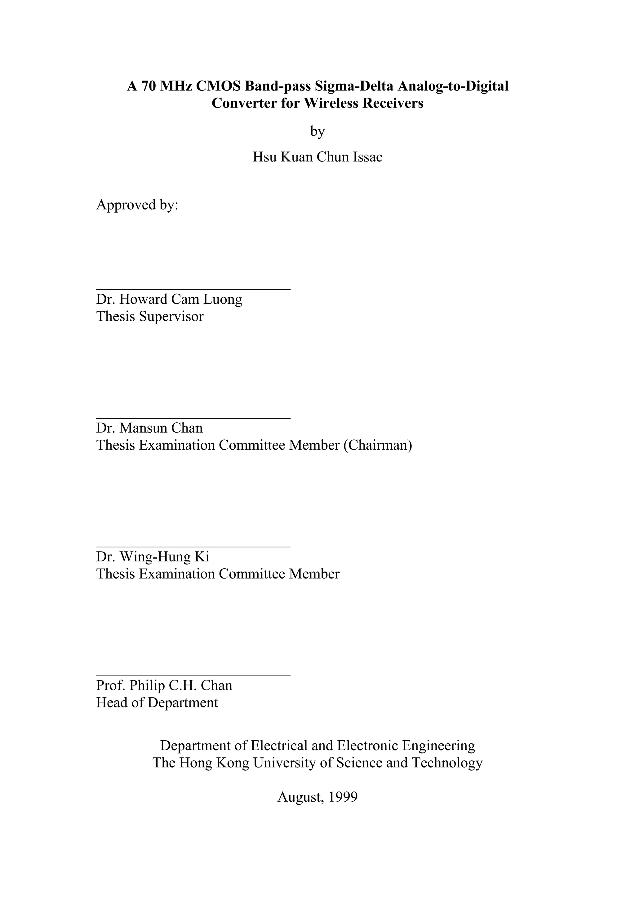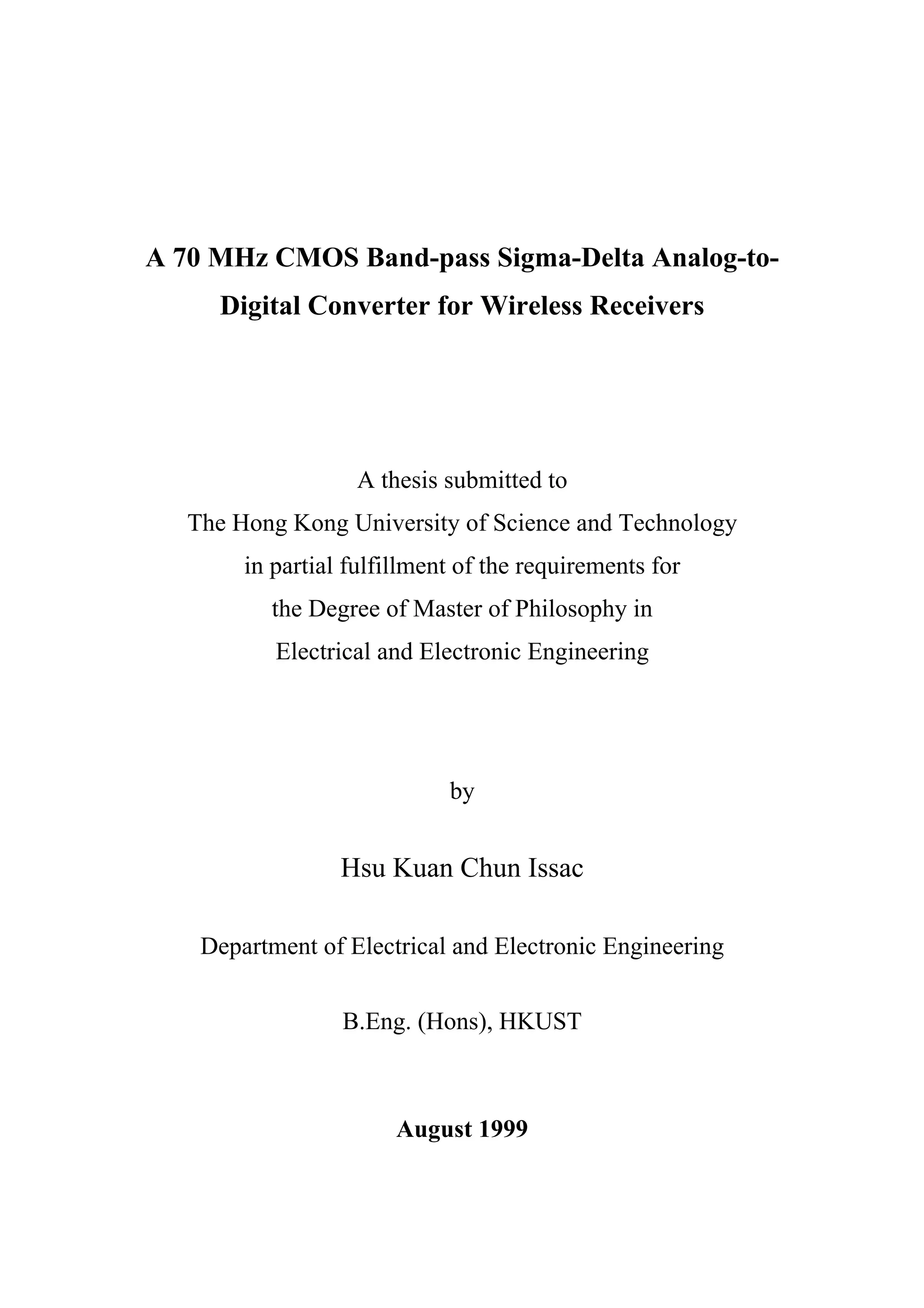 The document describes a thesis submitted by Hsu Kuan Chun Issac to the Hong Kong University of Science and Technology for a Master of Philosophy degree in Electrical and Electronic Engineering. The thesis proposes designing a 70 MHz CMOS band-pass sigma-delta analog-to-digital converter for wireless receivers. It describes implementing a second-order continuous-time band-pass sigma-delta modulator using transconductor-capacitor integrators for the loop filter. The design includes a latched comparator and TSPC D flip-flop as the quantizer. The performance of prototypes fabricated in 0.8um and 0.5um CMOS processes are evaluated.