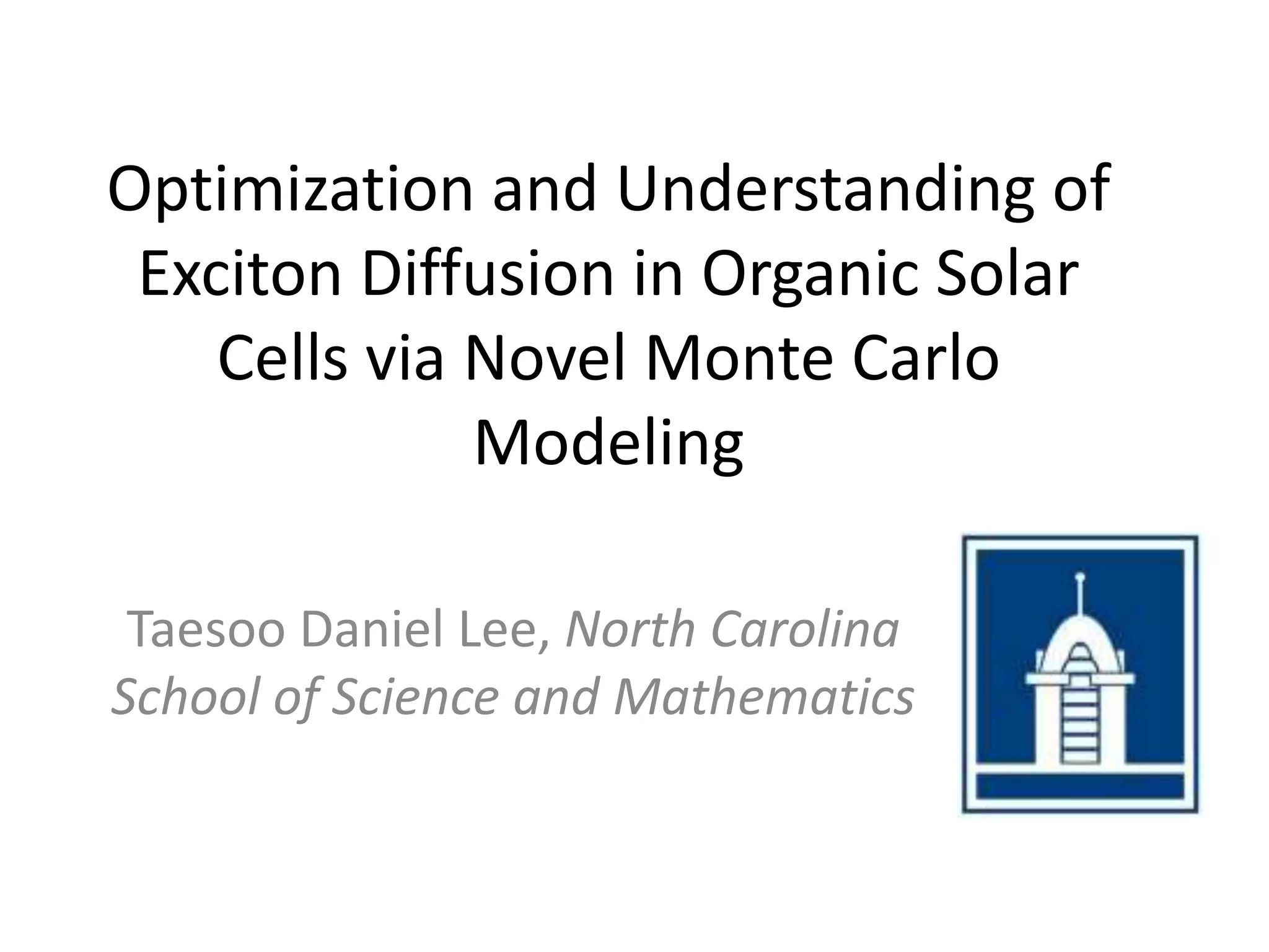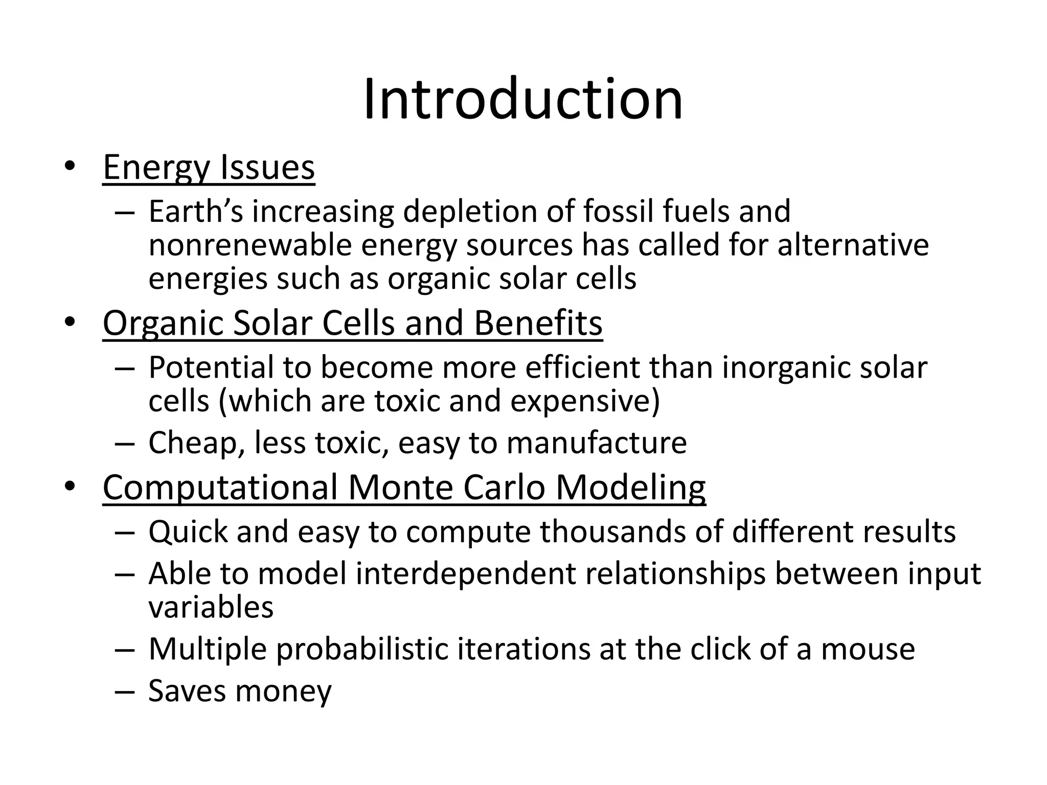 1) The document describes a Monte Carlo model developed to simulate exciton diffusion in organic solar cells containing different porphyrin compounds.