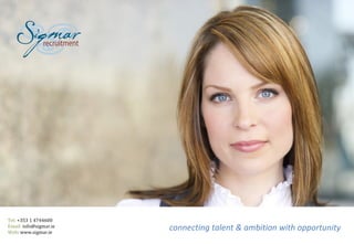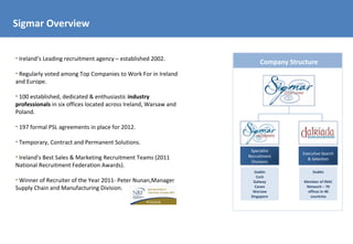 Sigmar is Ireland's leading recruitment agency established in 2002 with over 100 recruitment professionals across offices in Ireland, Poland, and Singapore. Sigmar specializes in temporary, contract, and permanent recruitment for industries such as banking, IT, engineering, and pharmaceuticals. Sigmar sources candidates through screening, interviews, and profiles candidates before recommending strong matches to clients. Sigmar prides itself on a strong brand, excellent candidate experience, extensive client base, and geographical reach to connect talent with opportunity.