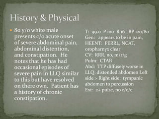 An 80-year-old man presented with acute severe abdominal pain, distention, and constipation. Physical exam revealed a distended abdomen with tenderness worse in the lower left quadrant. Imaging showed signs of sigmoid volvulus including the coffee bean sign and left flank overlap sign. Treatment included decompression, IV fluids, analgesics, and surgical consultation given the risk of complications from the sigmoid volvulus like ischemia or perforation.