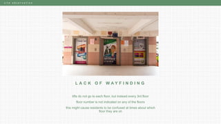 This document proposes a green signage system for a residential building to help with wayfinding issues. It involves installing modular planter boxes with mother-in-law's tongue plants beside the lifts on select floors. The plants would spell out the floor number and act as a community engagement project. Details of the proposed design, materials, budget, timeline and group members are provided.