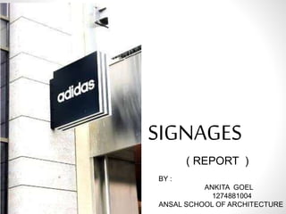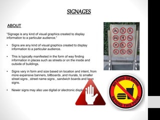 Signage refers to visual graphics that display information to an audience. Signs come in various forms and sizes depending on their location and purpose, ranging from banners and billboards to street signs. Common materials used for signs include acrylic, aluminum, plastic, and vinyl. Sign shapes like rectangles, circles and triangles are used to convey different types of information like directions, warnings, and regulations. Signage serves purposes like providing information, directions, identification, safety instructions and rules. Newer signage options include digital, LED, neon and 3D signs.