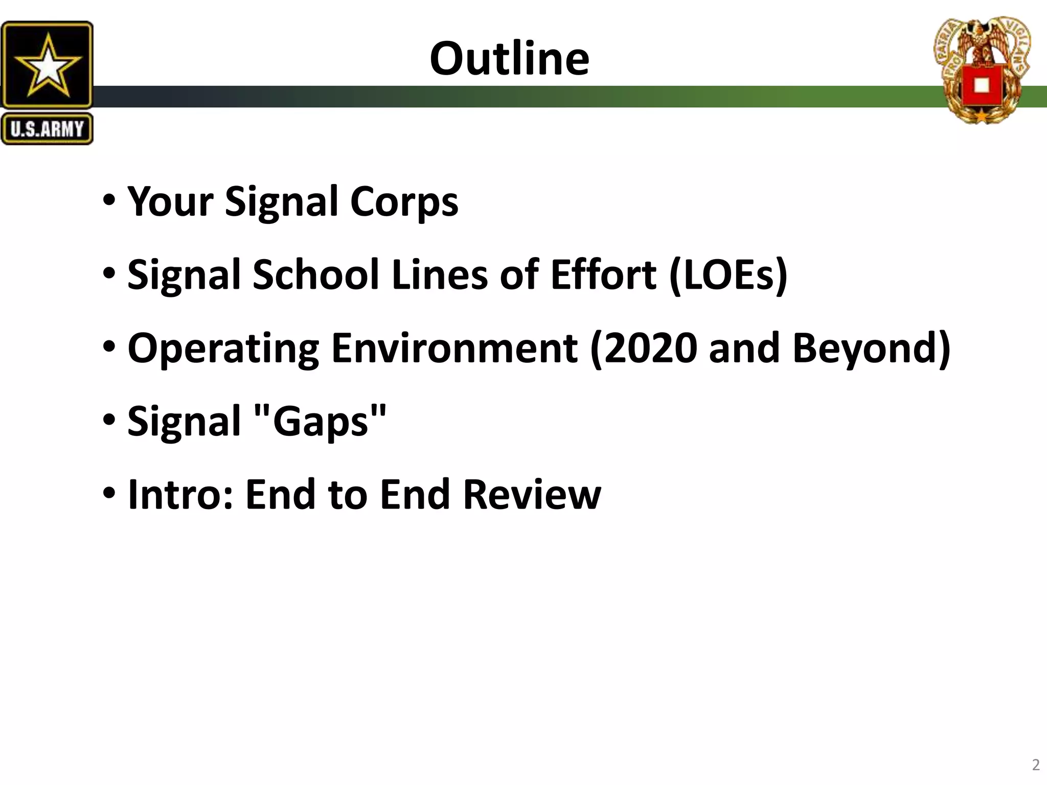 The document details updates and strategies related to the U.S. Army Signal School, highlighting the current structure, personnel, and efforts to enhance training and operational capabilities within the Signal Corps. It addresses the challenges faced in mission command, training gaps, and the need for modernization in communications and network infrastructures. Future objectives aim to optimize capabilities, establish a unified network, and develop a skilled workforce for effective military operations in a complex environment.