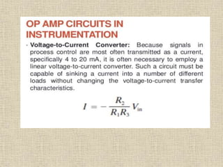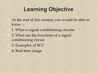 This document discusses signal conditioning circuits. It defines signal conditioning as the manipulation of an analog signal to meet the requirements of subsequent processing stages. Some key functions of signal conditioning circuits include amplification, filtering, attenuation, and linearization. Operational amplifiers are commonly used to amplify signals in signal conditioning stages. The document provides examples of signal conditioning circuits and discusses their use in applications like analog to digital conversion and control engineering.