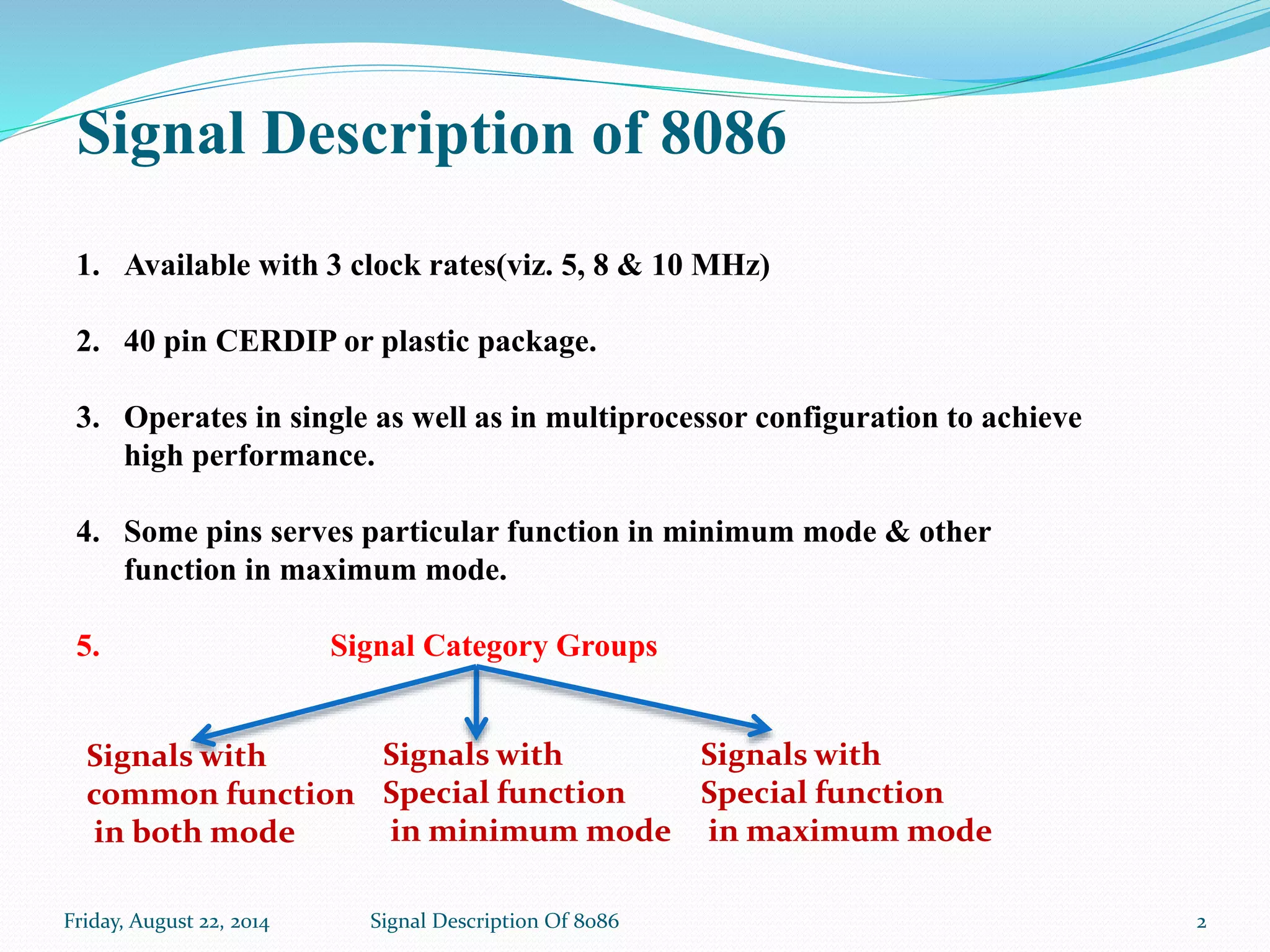 The document discusses the signal description of the 8086 microprocessor. It describes that the 8086 has 40 pins and can operate at 5, 8, or 10 MHz clock speeds. It operates in single or multiprocessor configurations. Some pins have different functions depending on whether it is in minimum or maximum mode. The document then lists the various signals, their abbreviations, and briefly describes the purpose of several important pins including CLK, RESET, VCC, GND, INTA, ALE, HLDA, DT/R and DEN.