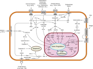 This document provides an overview of signal transduction. It begins with defining signal transduction as the process by which extracellular signaling molecules activate cell surface or intracellular receptors, triggering a biochemical chain reaction that results in a cellular response. The document then discusses the history of studying signal transduction, examples of environmental stimuli, types of receptors, second messengers, cellular responses, and major signaling pathways involved in signal transduction like the MAPK/ERK, cAMP-dependent, and IP3/DAG pathways.