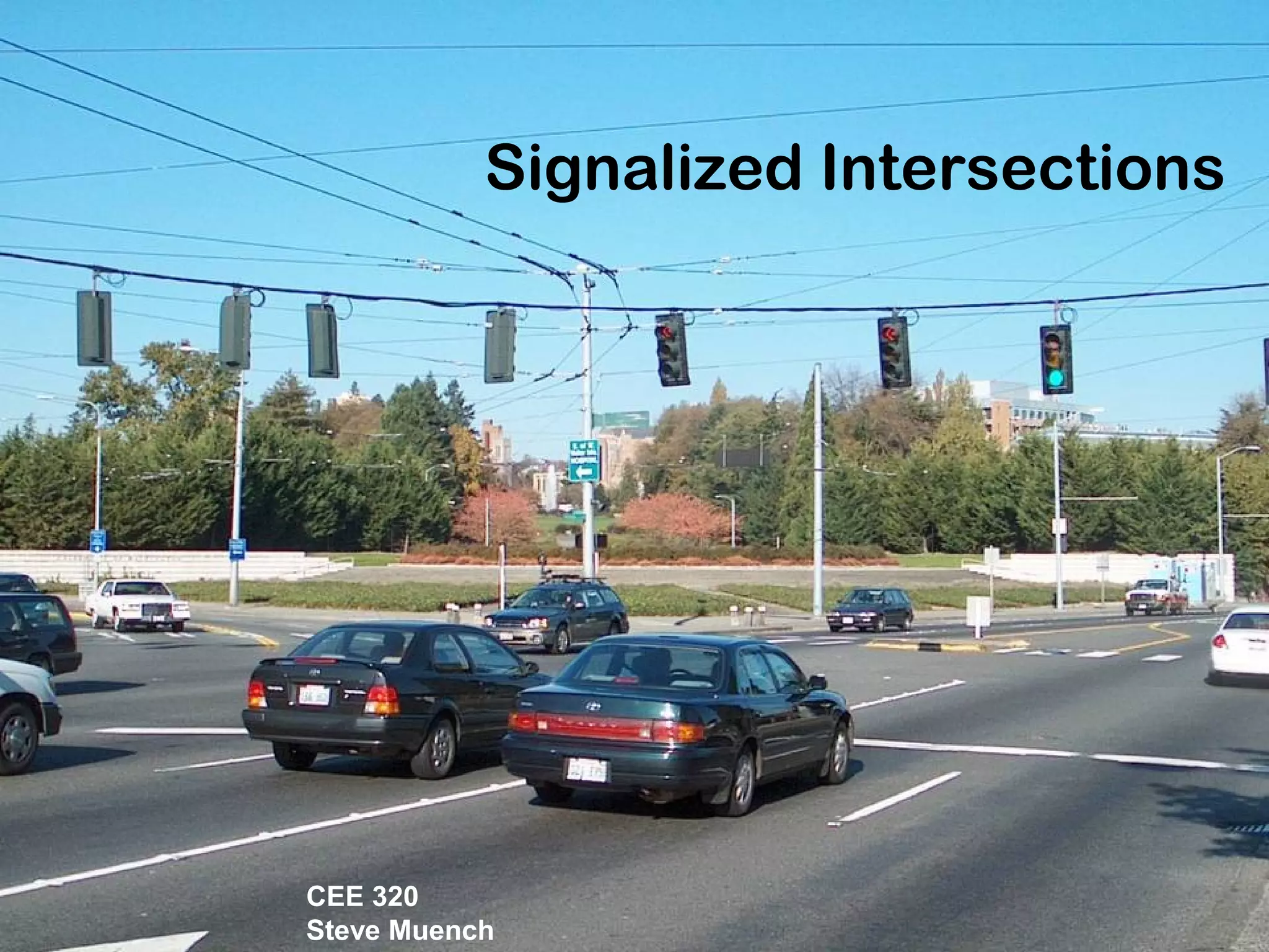 This document provides an overview of signalized intersection analysis and optimization for a transportation engineering course. It defines key terms related to signal timing, describes methods for calculating vehicle delay under uniform and random traffic arrivals, and approaches for optimizing cycle length, green time allocation, and level of service. Examples are provided to illustrate calculations for critical lane group volume-to-capacity ratio, total lost time, optimal signal timing, green time distribution, and intersection level of service.
