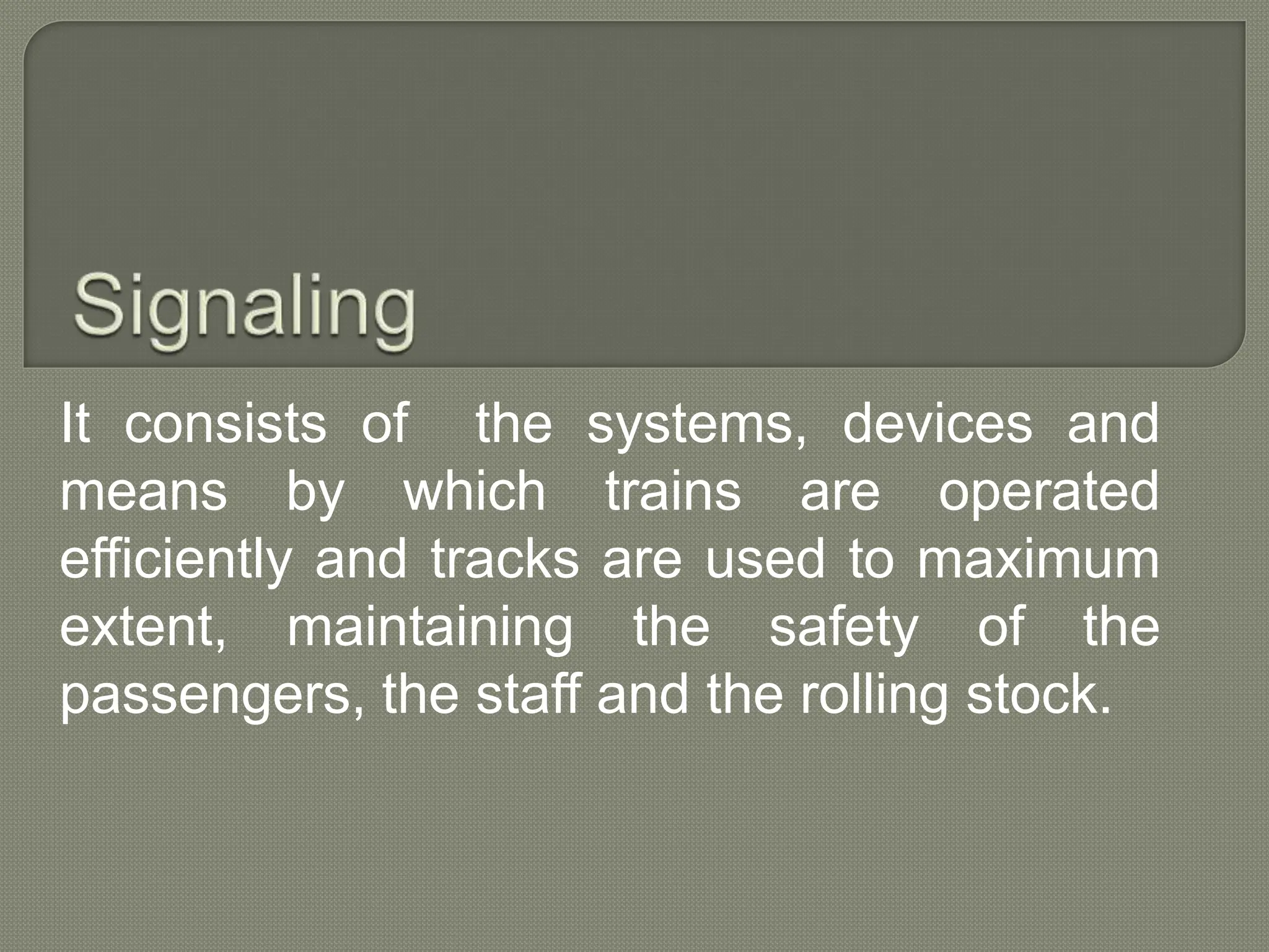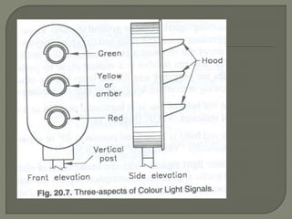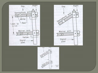 The document discusses different types of railway signaling systems. It describes signals that provide facilities for efficient train movement, ensure safety between trains, and maximize track utility. The key types discussed include detonating signals for fog conditions, fixed visual signals, semaphore signals, warner signals, shunting signals, colored light signals, and reception/departure signals like home and starter signals that control train entry and exit at stations.