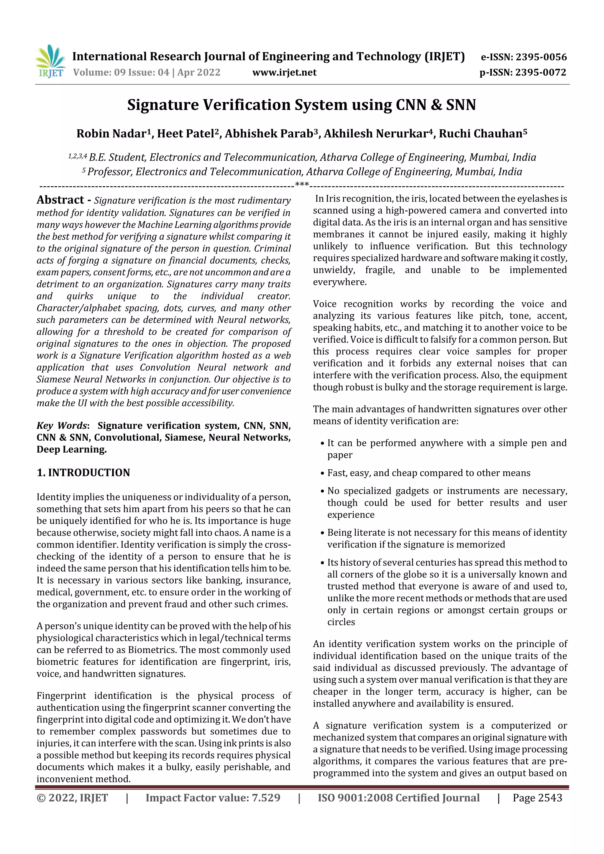This document describes a signature verification system that uses convolutional neural networks (CNNs) and siamese neural networks (SNNs). The system takes in signature images, preprocesses them by resizing and normalizing, then uses a CNN to extract features. A SNN compares features of two signatures to determine if they match. The architecture includes convolutional and pooling layers to learn features, then fully connected layers. A contrastive loss function is used to minimize distance between matching signatures and maximize distance between non-matches. The system achieves 86% accuracy on a dataset with a 3% tolerance for errors. It includes both a guest verification page and profile system for permanent signature storage.
