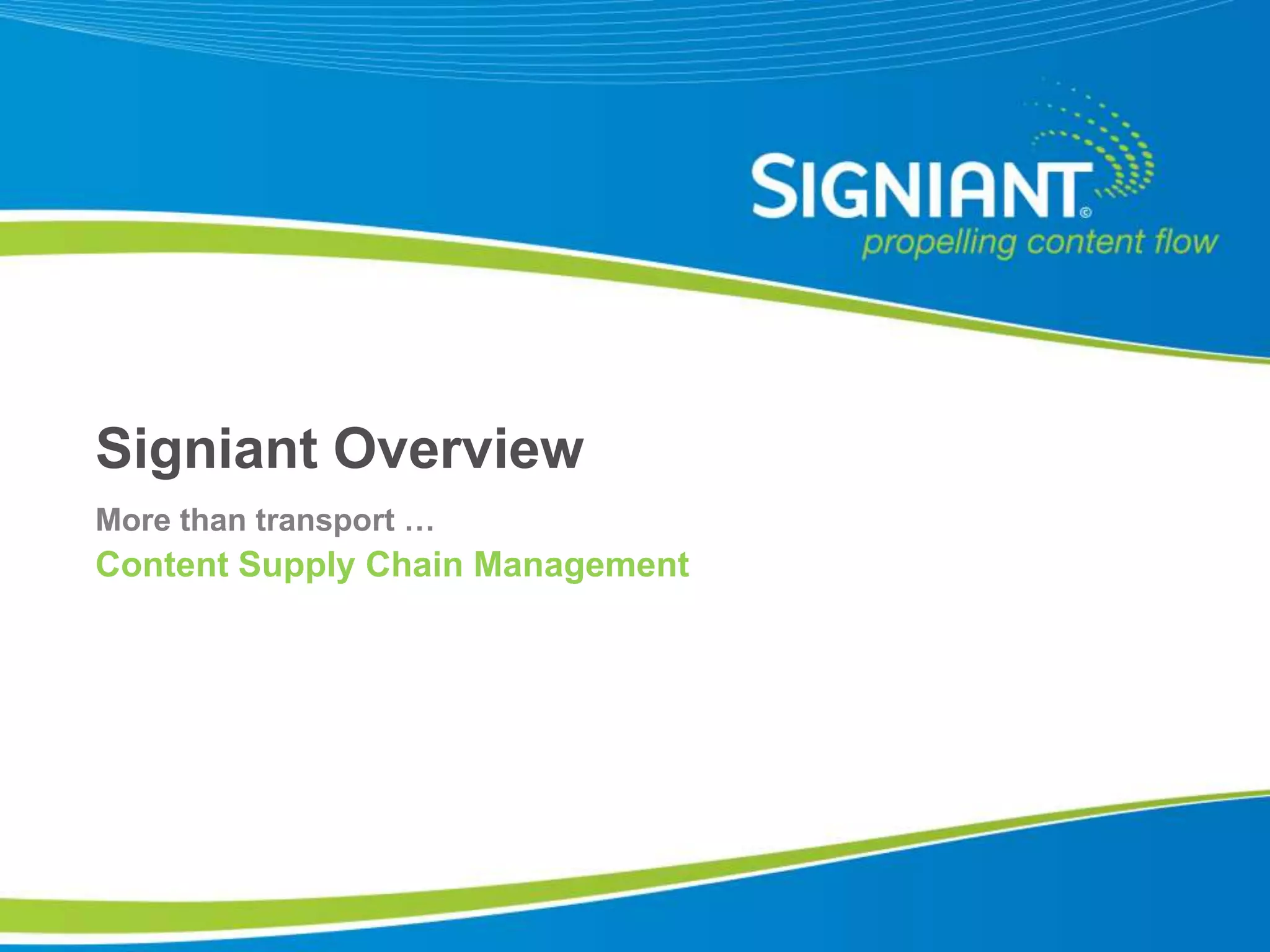 Signiant is a software company specializing in content supply chain management, enabling organizations to automate and manage the global distribution of digital media. Founded in 2000, it has over 10,000 media agents deployed and serves more than 400 customers, including major events like the FIFA World Cup and the Vancouver Olympics. Key offerings include accelerated content transport, central management, and automation solutions that cater to various industries such as broadcasting, healthcare, and technology.