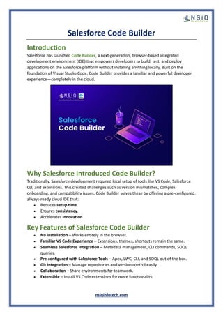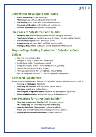 Salesforce has introduced Code Builder, a browser-based IDE that allows developers to build, test, and deploy applications on the Salesforce platform without installing anything locally, providing a powerful cloud-based developer experience. A Salesforce development company in USA plays a role in eliminating setup barriers and empowering developers to build smarter and faster. It is used to streamline development by providing a pre-configured cloud IDE, reducing setup time, ensuring consistency, and accelerating innovation. Read here to know more!