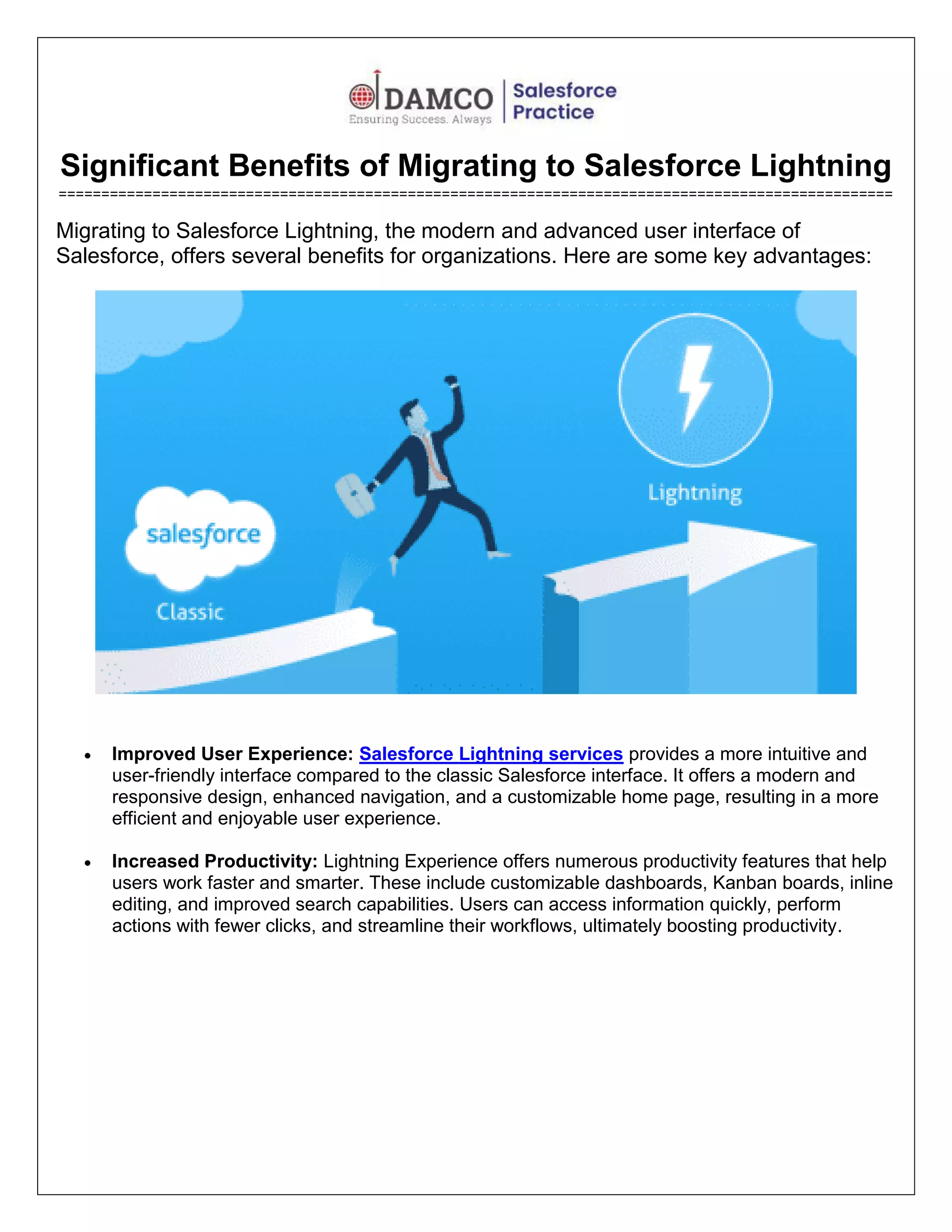 Migrating to Salesforce Lightning offers significant benefits such as improved user experience with a modern interface, increased productivity with customizable features, and enhanced mobility through mobile optimization. Additionally, it provides advanced reporting and analytics, a powerful app builder for custom applications, and seamless integration with other systems. Organizations can access continuous innovations and updates, but successful migration requires proper planning and change management.