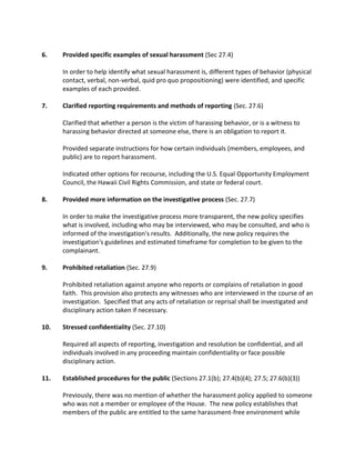 1. The new House harassment policy features significant changes, including providing clearer definitions and examples of harassment, bullying, and sexual harassment.