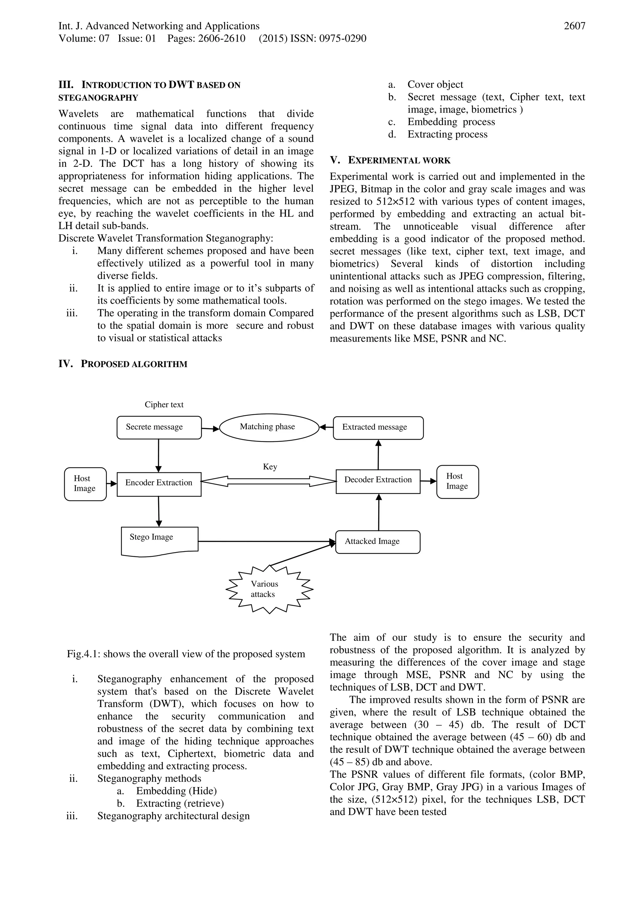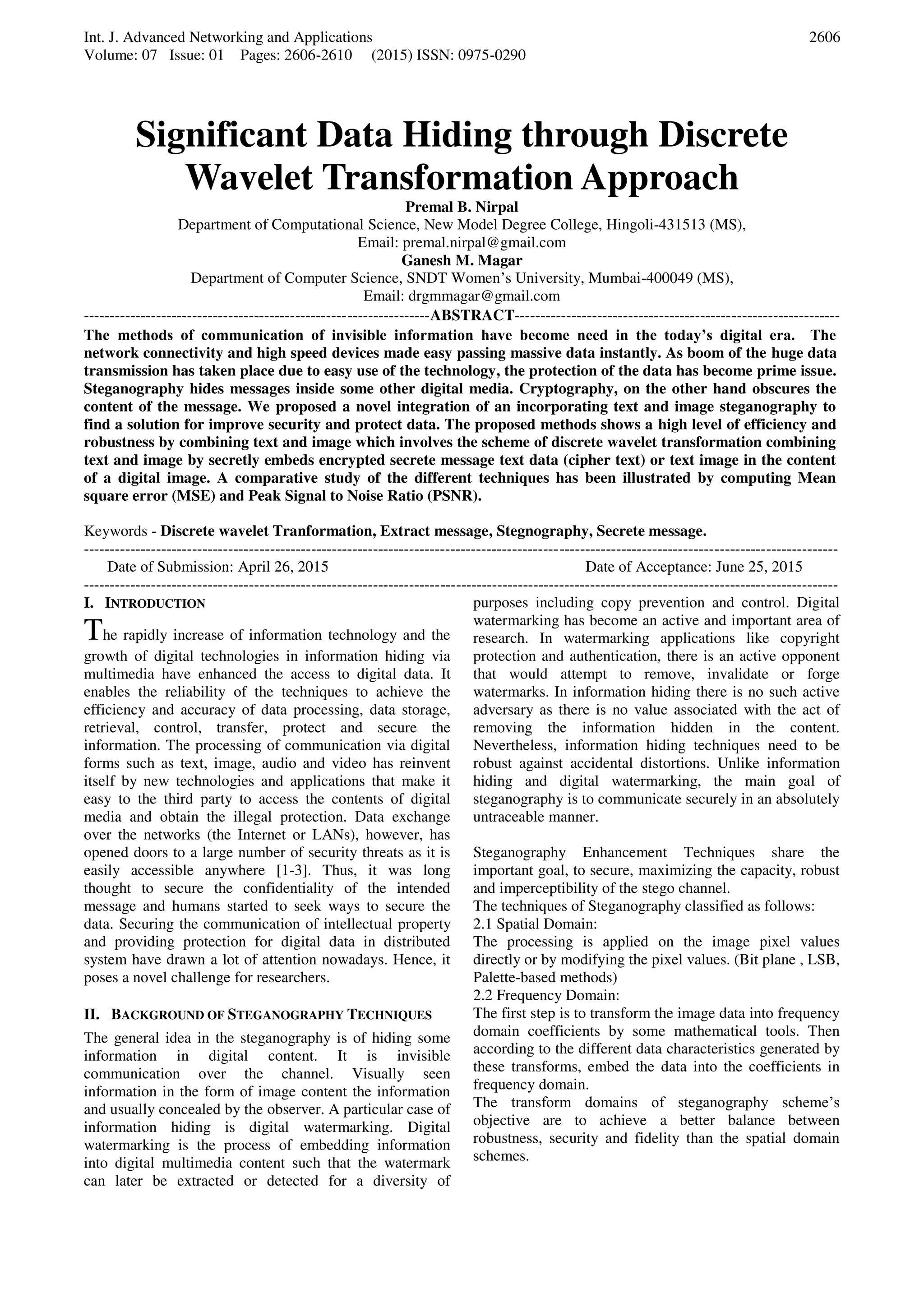 This document discusses a novel approach to data hiding using discrete wavelet transformation (DWT) to enhance security and efficiency in steganography by embedding encrypted text within digital images. It compares different steganography techniques, demonstrating that the DWT method yields superior performance in terms of peak signal-to-noise ratio (PSNR) and mean square error (MSE), indicating better robustness against image distortions. The research highlights the need for further exploration of secure data hiding methods across various media formats and sizes.