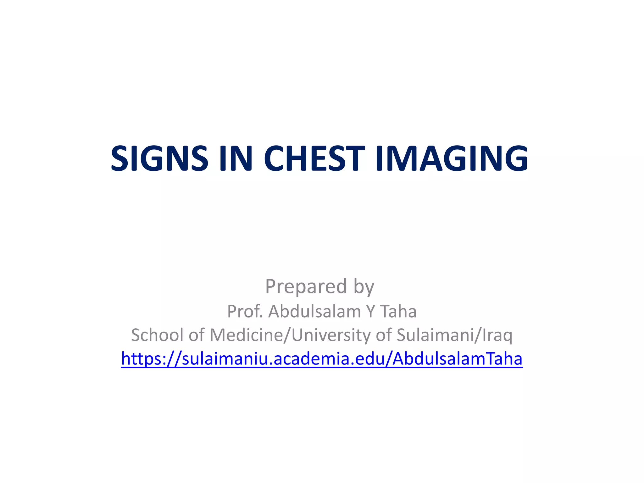 The document discusses signs in chest imaging as prepared by Prof. Abdulsalam Y Taha from the School of Medicine at the University of Sulaimani, Iraq. It indicates that the lecture material is derived from a specific article. Additionally, a link to the author's Academia.edu profile is provided.