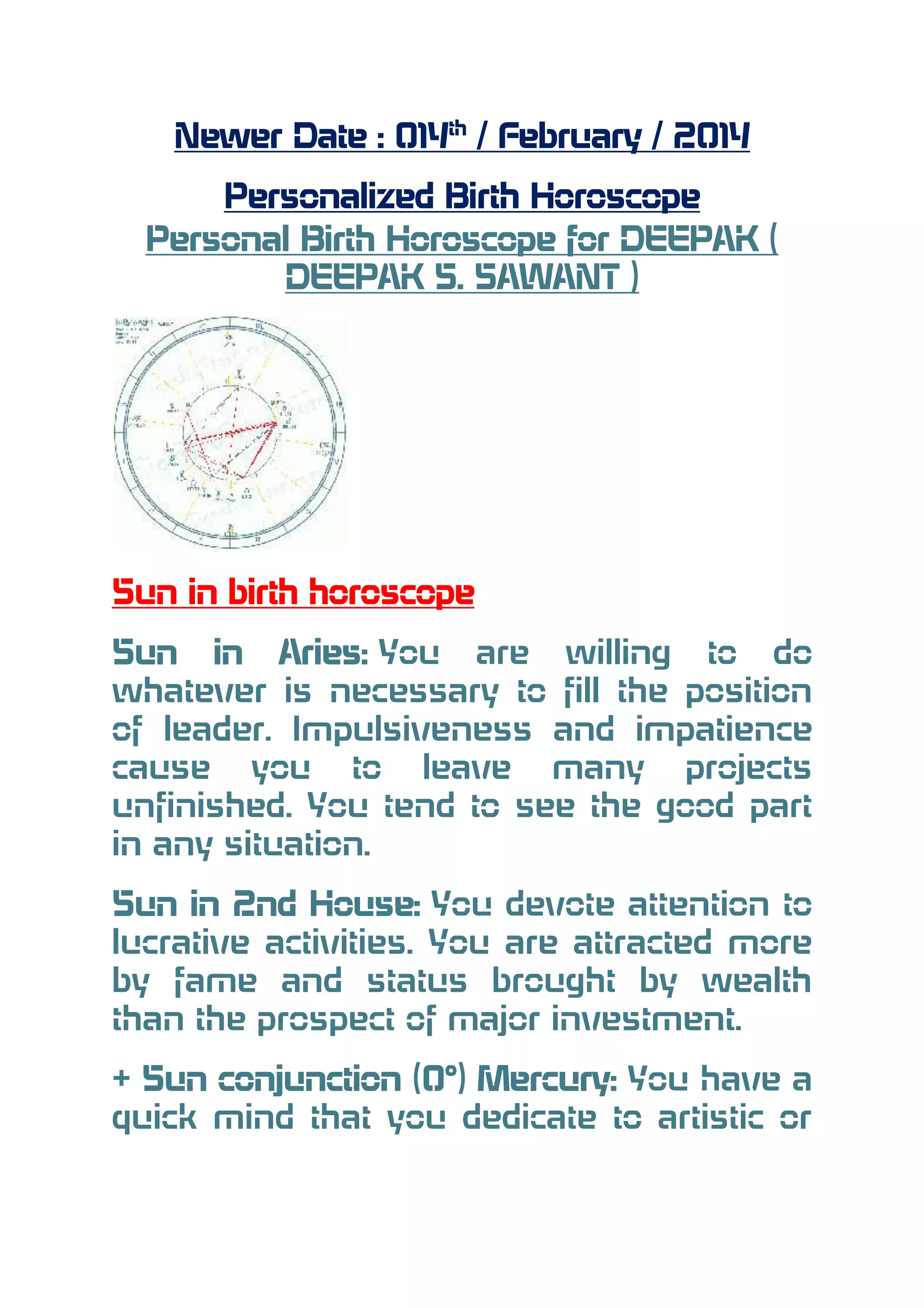 This document provides a personalized birth horoscope for Deepak Sawant based on the positions of planets and other astrological factors at the time of his birth. It analyzes aspects of Deepak's personality, tendencies, strengths and weaknesses related to leadership, relationships, career, finances and other life areas based on the placement of the sun, moon, mercury, venus, mars and other planets in his natal chart. The horoscope also provides interpretations of conjunctions, oppositions and other astrological aspects that influence Deepak and offers guidance on areas of growth.