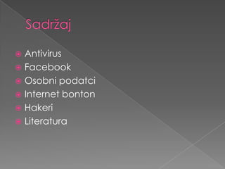Dokument pruža savjete o sigurnosti na internetu, uključujući važnost korištenja antivirusnih programa i oprez pri interakciji s nepoznatim osobama na društvenim mrežama. Naglašava se izbjegavanje dijeljenja osobnih podataka i neprimjerenog ponašanja online. Također se upozorava na zloćudne namjere na internetu.