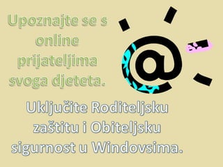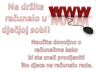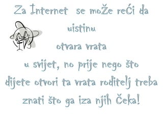 Internet pruža korisnicima, uključujući djecu, velike mogućnosti za komunikaciju, ali nosi i mnoge rizike kao što su neprimjereni sadržaji, cyberbullying i zlostavljanje. Važno je educirati djecu o sigurnom korištenju interneta, postaviti pravila i pratiti njihove online aktivnosti kako bi se smanjili potencijalni problemi. Roditelji i nastavnici trebaju imati povjerenje i otvorenu komunikaciju s djecom kako bi ih zaštitili od opasnosti na mreži.