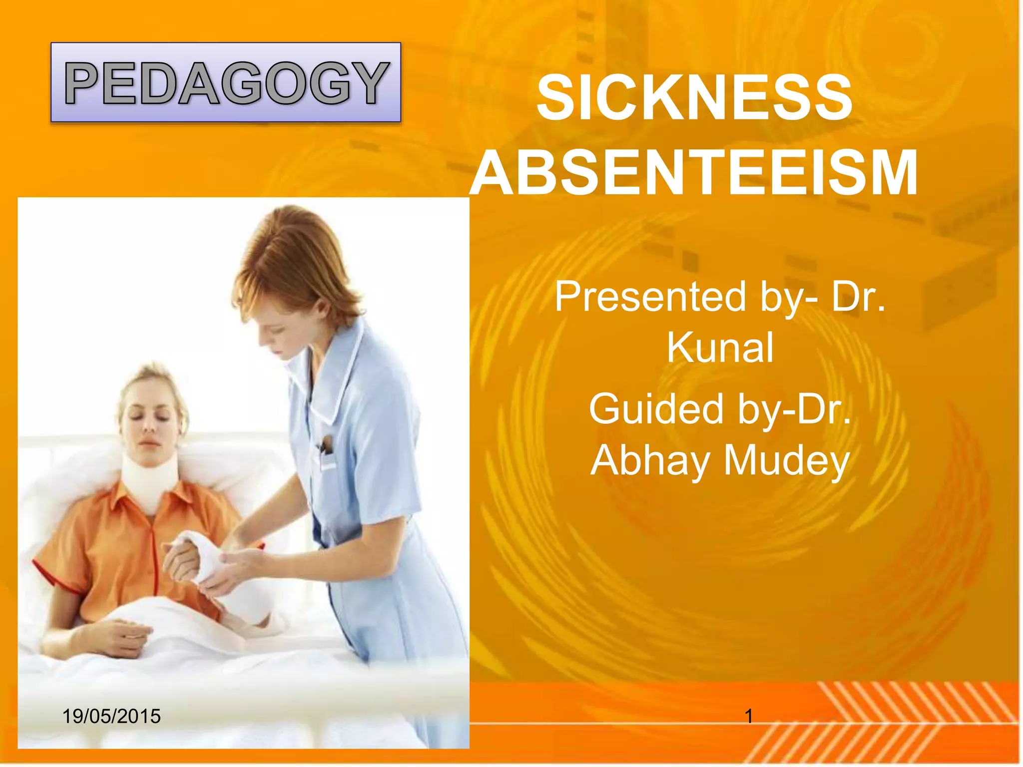 This document discusses sickness absence and its relationship to illness and disease. It defines illness, disease, and sickness and notes that sickness absence rates in India have increased from 8-13% in the early 1950s to 15-20% in recent years. Individual, work-related, and non-work factors can influence sickness absence. Absenteeism can be voluntary or involuntary and has several causes. High absenteeism negatively impacts productivity and costs. Various approaches can be used to control absenteeism, including disciplinary action, positive reinforcement, and paid time-off programs. Effective absence management aims to create work environments where employees feel less inclined to miss work.