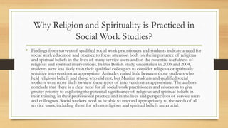 The document discusses the importance of religious and spiritual beliefs in social work education and practice according to a British study from 2003-2004. It found that while qualified social workers viewed spiritually sensitive interventions as appropriate, students were less likely to. Attitudes also varied by religion, with Muslim students and social workers more open to such interventions. The authors conclude there is a need for greater focus on the role of religious and spiritual beliefs in training, professional practice, and serving clients in the social work field. Social workers must be able to respond appropriately to the needs of all clients, including those for whom religion and spirituality are important.
