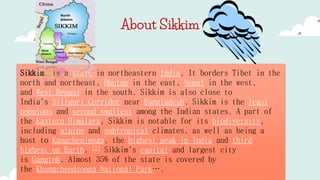 Sikkim is a state in northeastern India that borders Tibet, Bhutan, Nepal, and West Bengal. It is the least populous and second smallest of India's states. Sikkim has a diverse landscape ranging from subtropical to alpine climates and is home to Kangchenjunga, the highest peak in India. The predominant religions are Hinduism and Vajrayana Buddhism, and the capital and largest city is Gangtok. Sikkim has a largely agriculture-based economy that is also dependent on tourism.