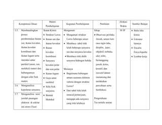 Silabus mata pelajaran kimia kelas X membahas ikatan kimia. Pokok bahasannya meliputi struktur Lewis, ikatan ion dan kovalen, ikatan koordinasi, senyawa polar dan nonpolar, ikatan logam, serta hubungan antara ikatan kimia dengan sifat fisik senyawa. Pembelajaran akan meliputi observasi, diskusi, dan percobaan tentang konsep-konsep tersebut. Penilaian mencakup sikap ilmiah, pengetahuan, dan keterampilan prakt