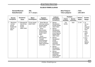 Dokumen ini adalah silabus pembelajaran untuk mata pelajaran fiqih kelas X di Madrasah Aliyah, mencakup semester ganjil dan genap tahun pelajaran 2013-2014. Silabus ini mencakup berbagai kompetensi dasar mengenai ibadah Islam, zakat, haji, qurban, aqiqah, dan pengurusan jenazah, lengkap dengan materi, kegiatan pembelajaran, dan teknik penilaian. Setiap bagian berfokus pada pemahaman prinsip-prinsip dan penerapan hukum Islam dalam kehidupan sehari-hari.
